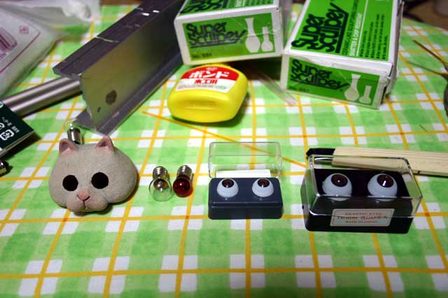 こちらは事前に用意した一般的な人形用のプラスチック製ドールアイ。しかしやはり既製品ではサイズが合わず、ネコ目のものも入手できなかったので1から自作する事に。